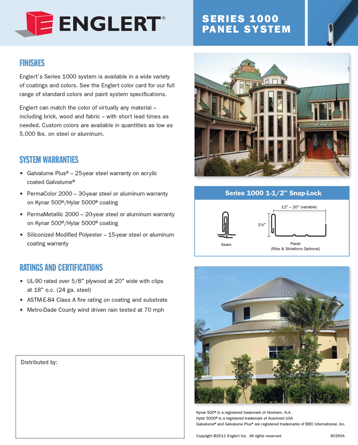 Englert’s Series 1000 system is designed for sloped roofs and other exterior surfaces of light commercial and residential projects. The 1000 profile, with concealed clips and fasteners, requires no mechanical seaming or separate seam cap.