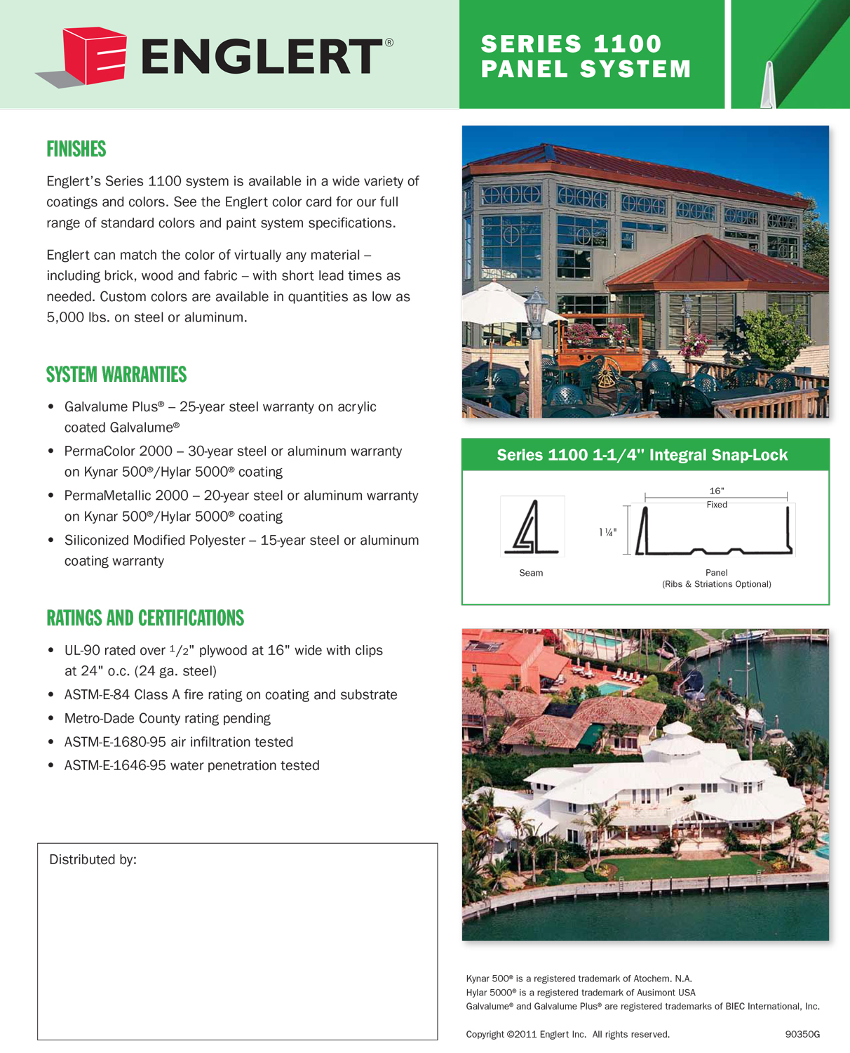 Englert’s Series 1100 system is designed for sloped roofs and other exterior surfaces of light commercial and residential projects. The 1100 profile, with concealed clips and fasteners, requires no mechanical seaming or separate seam cap.